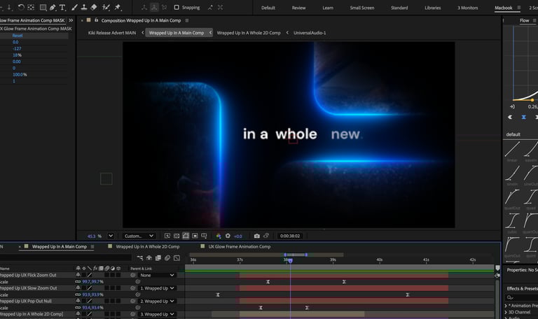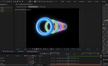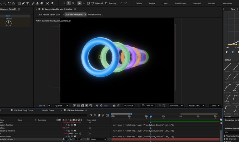 The ring intro took a while to nail the movement of the rings splaying and then flattening to a row. To direct the camera I was using a plugin called handycam, which provides better axis control than the standard AE camera system.