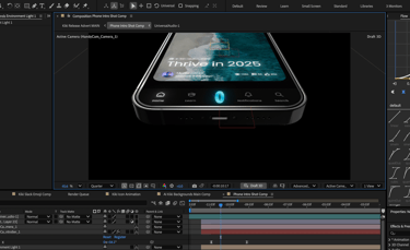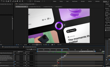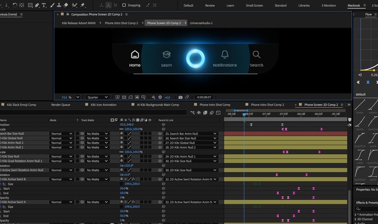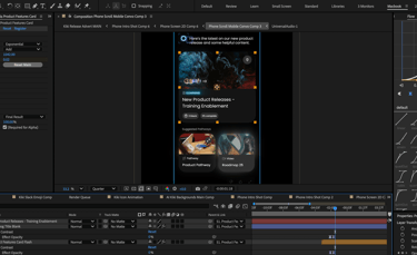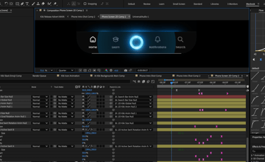 The main animation process began with rigging a 3d iPhone with interchanagable phone screen comps. I used After Effects new Advanced 3d renderer to gain access to ray traced lighting, with 2d comps nested within for the UI screens.