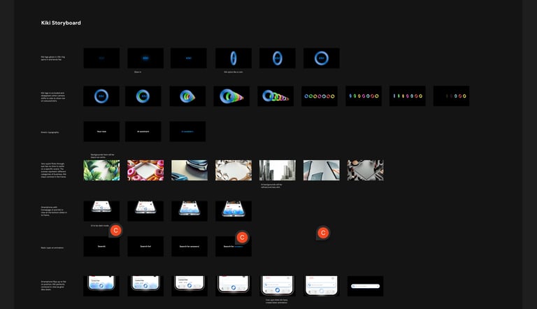 Once the main design of Kiki was signed off, I began mapping out a storyboard whilst looping in with UI/UX team and Marketing department to align the visuals and cross check product facts with the project managers. I roughed up the screens quickly to portray the general idea to the CEO whilst confirming the animations portrayed the script points correctly.