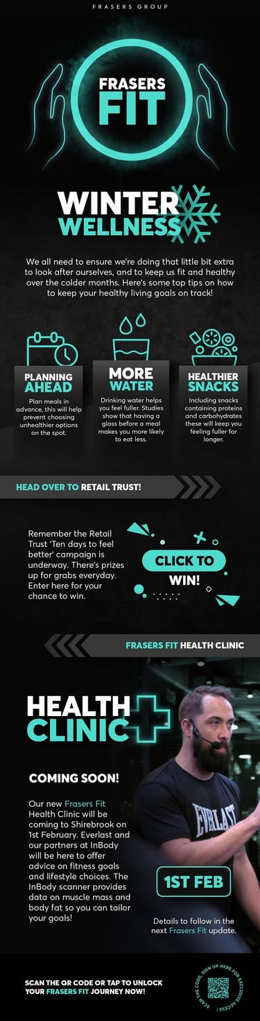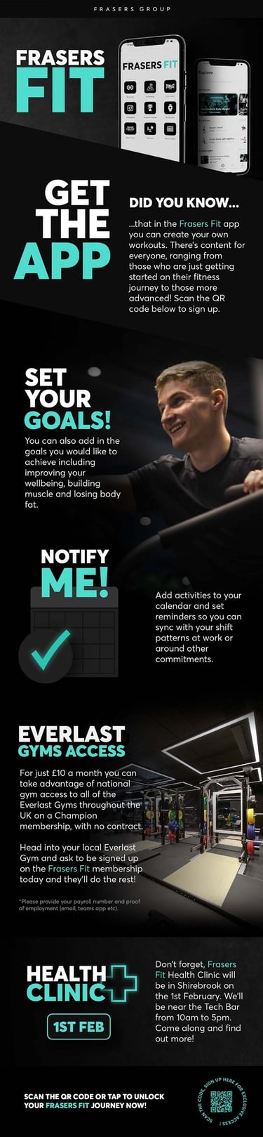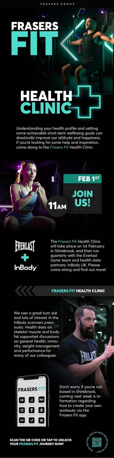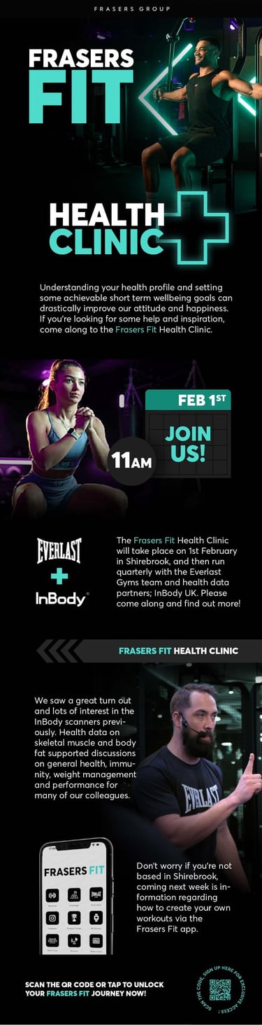 I was tasked with delivering the first few communications, which would act as basis for other in house graphics designers to follow. The designs were optimised in long format for mobile readability as most of the employees received these communications via mobile. The format to follow was an eye catching header to lead the eye in, followed by broken up sections using a mixture of photos and iconography to describe the text. I avoided breaking up the designs with over stated lines to encourage the audience to read through to the end of the communication. The call to action was a link/QR code sign posting employees to download the Frasers Fit app for use in Everlast gyms.