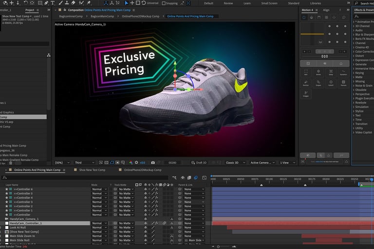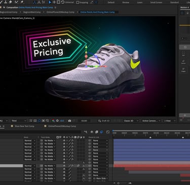 One of the shots I enjoyed creating the most was the 'falling shoe'. The client desired to showcase one of their flagship projects with a quick 'cameo' featuring a Nike 'Invigor' trainer. I scanned a shoe provided by them using the 'Polycam' app, generating a ready-made and textured 3D model of the shoe. I then imported it into After Effects using their new Advanced renderer. After a bit of relighting, the end result was surprisingly convincing despite minimal cleanup on the 3D model.