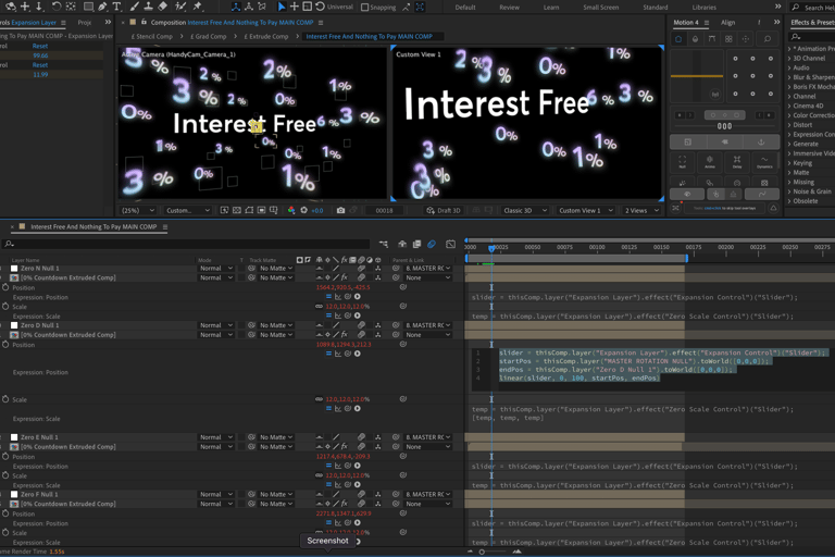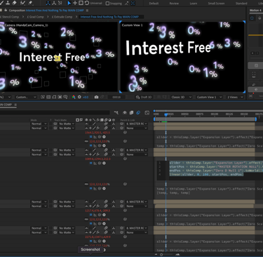 All the animations were built within After Effects, utilizing both the classic and advanced 3D renderer. Certain shots required extensive scripting, such as the animation for the 0% interest free offer. To achieve the imploding and exploding animation effect, I rigged all the digits to a slider controller that referenced two defined nulls, globally adjusting their positions based on a percentage between the starting and ending null positions. This approach streamlined the animation process, avoiding the need for manual adjustments to each digit's animation.
