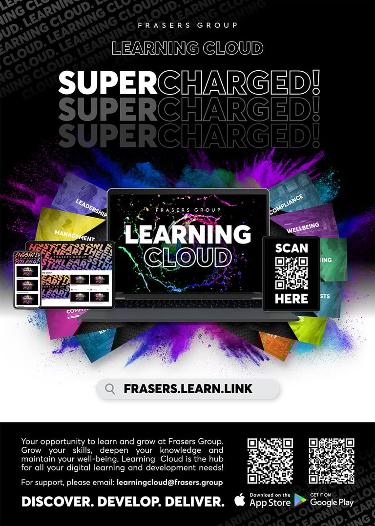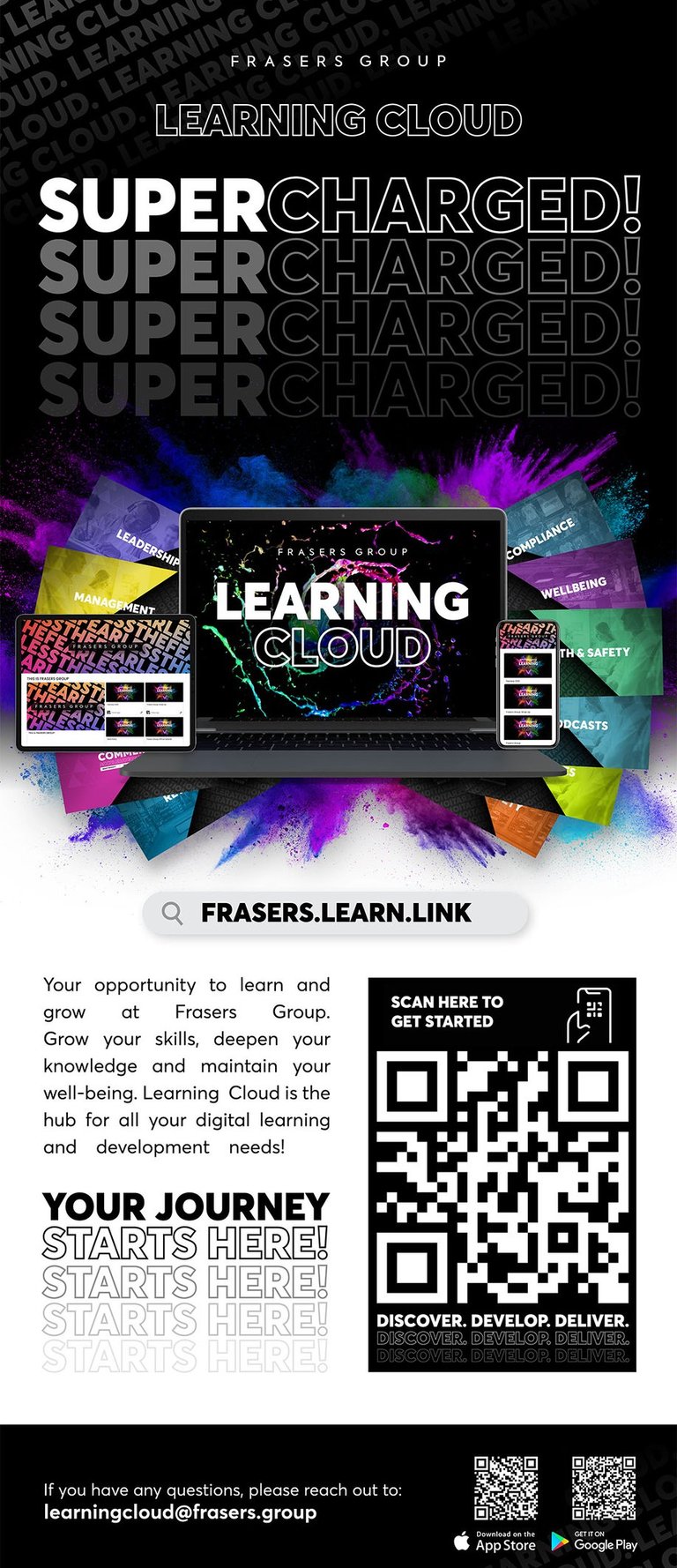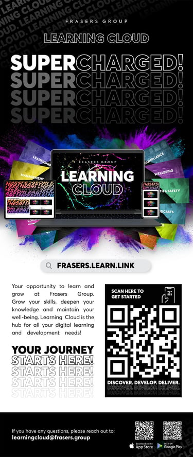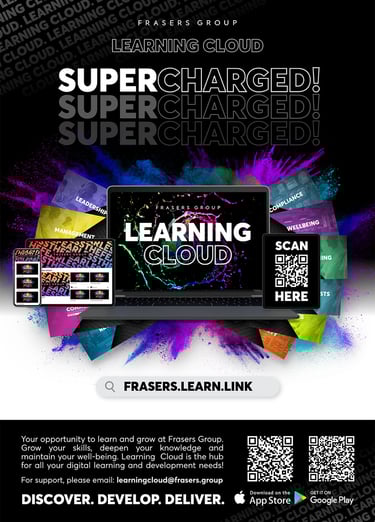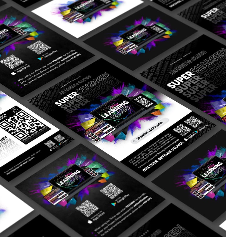 Frasers Group were launching their new e-learning website named 'Learning Cloud powered by Thrive; a SaaS platform that was easy and accessible to use. To encourage all 33,000 employees to sign up for the new site, an eye catching campaign had to be created to excite and entice. I was tasked with creating brand identity for Learning Cloud itself, which would then allow me to produce digital and print advertisements, plus an animation to spread the word at launch.